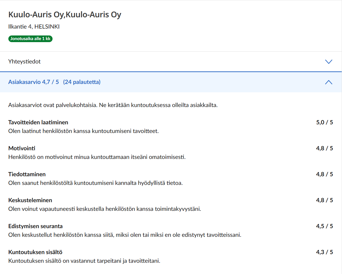 Me täällä Kuulo-Auriksessa keräämme kuntoutujilta palautetta joka viikko. Saamamme palautteen avulla pyrimme kehittämään toimintaamme. Tänä syksynä olemme saaneet yhteensä 42 palautetta ja keskiarvo (asteikolla 1-5) on ollut 4,5.